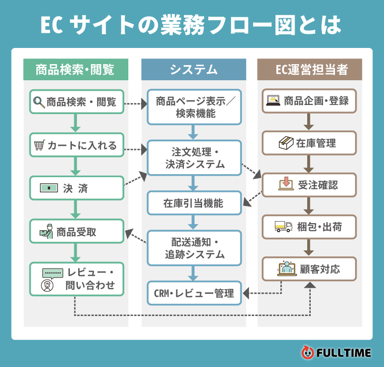 ECサイトの業務フロー図とは、運営に関わるすべての工程を時系列で整理し、「誰が・いつ・何をするのか」を明確に示す図解のことです。