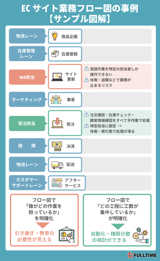 商品企画から集客、受注、配送、顧客対応までを一つの図に落とし込むことで、属人化していた業務が誰にでも理解できる形になります。