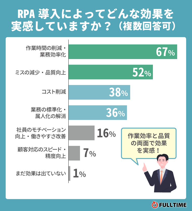 「ミスの減少・品質向上(52%)」の結果も加味すると、RPAが人手削減による効率化だけでなく、業務品質の安定にも寄与していることが明らかになりました。